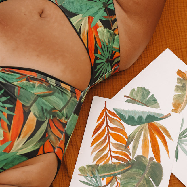 Cada traje de bano de Marveca es único. La obra de arte original está dibujada a mano por nuestra fundadora Magdalena e impresa en material reciclado de alta calidad.